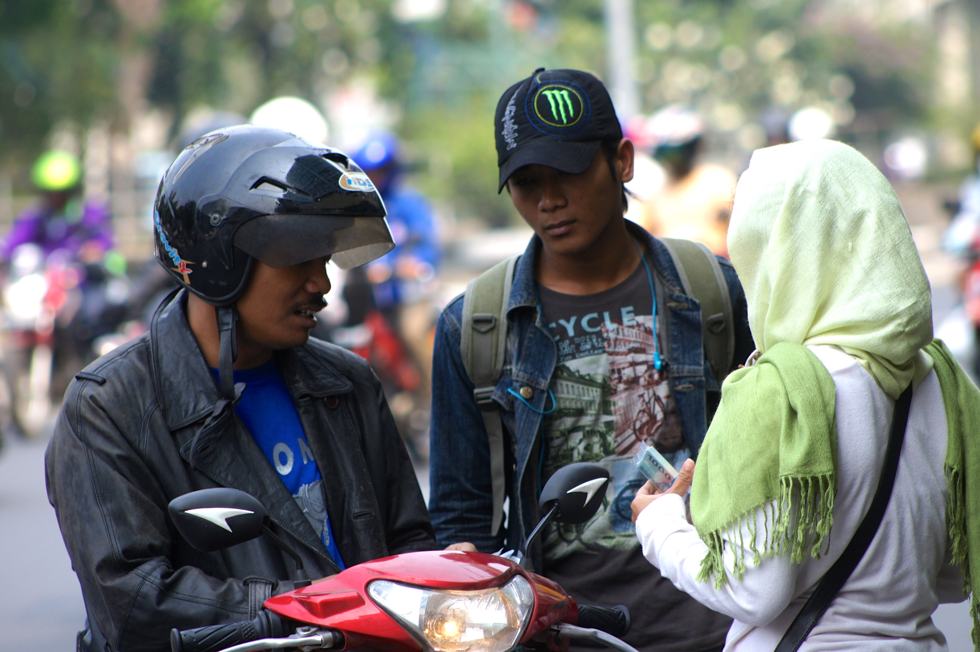 First, he needs to go to the bank to exchange the big notes for small ones: 1,000, 5,000 and 10,000 rupiah notes (10 cents, 50 cents and $1.05).